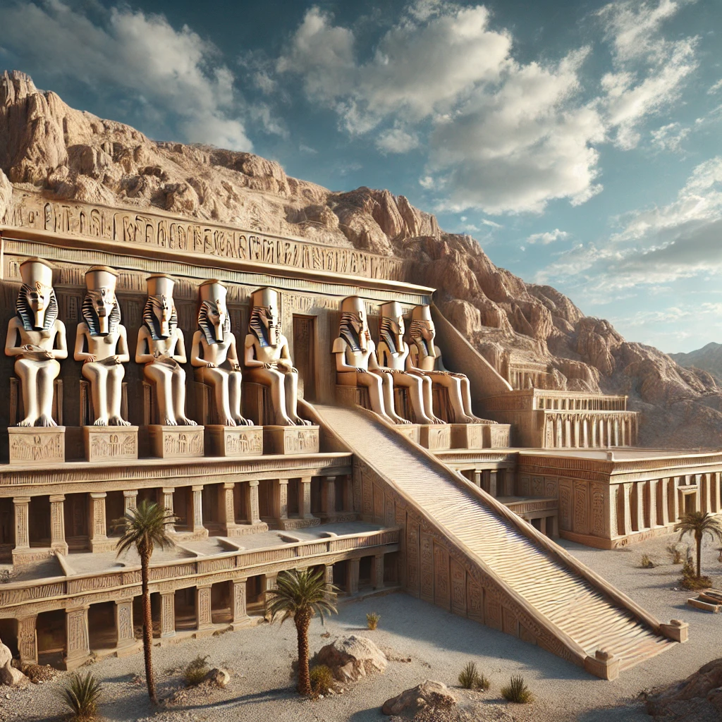 하트셉수트의 통치 시절, 그녀는 건축 프로젝트에 열정을 쏟았다. 그 중 가장 눈부신 유산은 '데르 엘 바하리' 신전이다. 이 신전은 나일강 서안의 거대한 절벽에 자리 잡고 있으며, 계단식으로 설계된 독특한 구조로 유명하다. 신전은 하트셉수트가 자신의 신성을 기리고, 이집트 신들에게 바친 헌신의 상징으로 지어졌다.