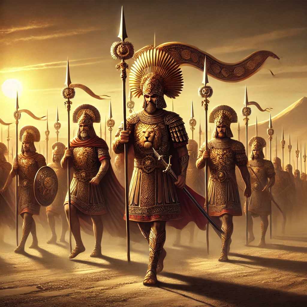 이들은 갑옷 대신 빛나는 비단 옷과 금으로 장식된 투구를 착용했으며, 이들의 무기에는 활과 화살, 단검, 창이 포함되었습니다. 특히, 손에 든 긴 창에는 금색 사자가 새겨져 있어 적군에게 두려움을 심어주었습니다.