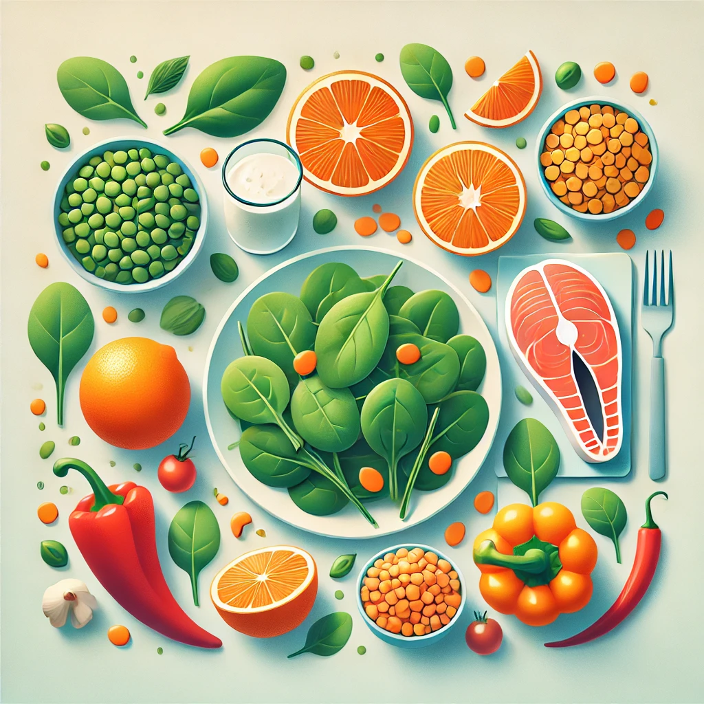 비타민 C는 비헴 철분의 흡수를 촉진합니다. 철분이 풍부한 시금치나 렌틸콩과 함께 오렌지, 키위, 파프리카 같은 비타민 C가 풍부한 식품을 섭취하면 효과적입니다.3. 칼슘과 철분 섭취 시간 분리