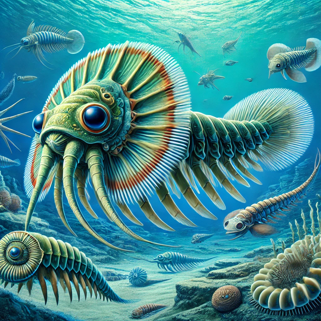 아노말로카리스는 약 5억 년 전 캄브리아기에 등장한 거대한 절지동물로, 당시 바다 생태계의 최상위 포식자였습니다. 몸길이는 약 1m에 이르렀으며, 당시 기준으로는 거대한 크기였습니다. 현재까지 발견된 화석을 통해 이 생명체는 독특한 두 개의 커다란 집게발과 복잡한 눈 구조를 가지고 있었다는 것이 밝혀졌습니다. 이 집게발은 먹이를 붙잡고 입으로 옮기기에 이상적이었습니다.