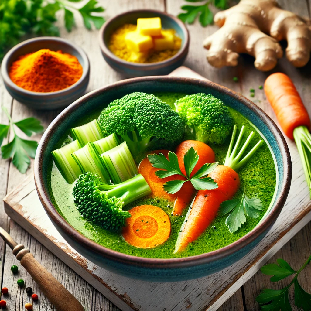재료: 브로콜리 1컵, 당근 1개, 셀러리 2대, 생강 1작은술, 강황 1작은술, 마늘 2쪽, 물 4컵, 올리브 오일 1큰술, 소금 약간