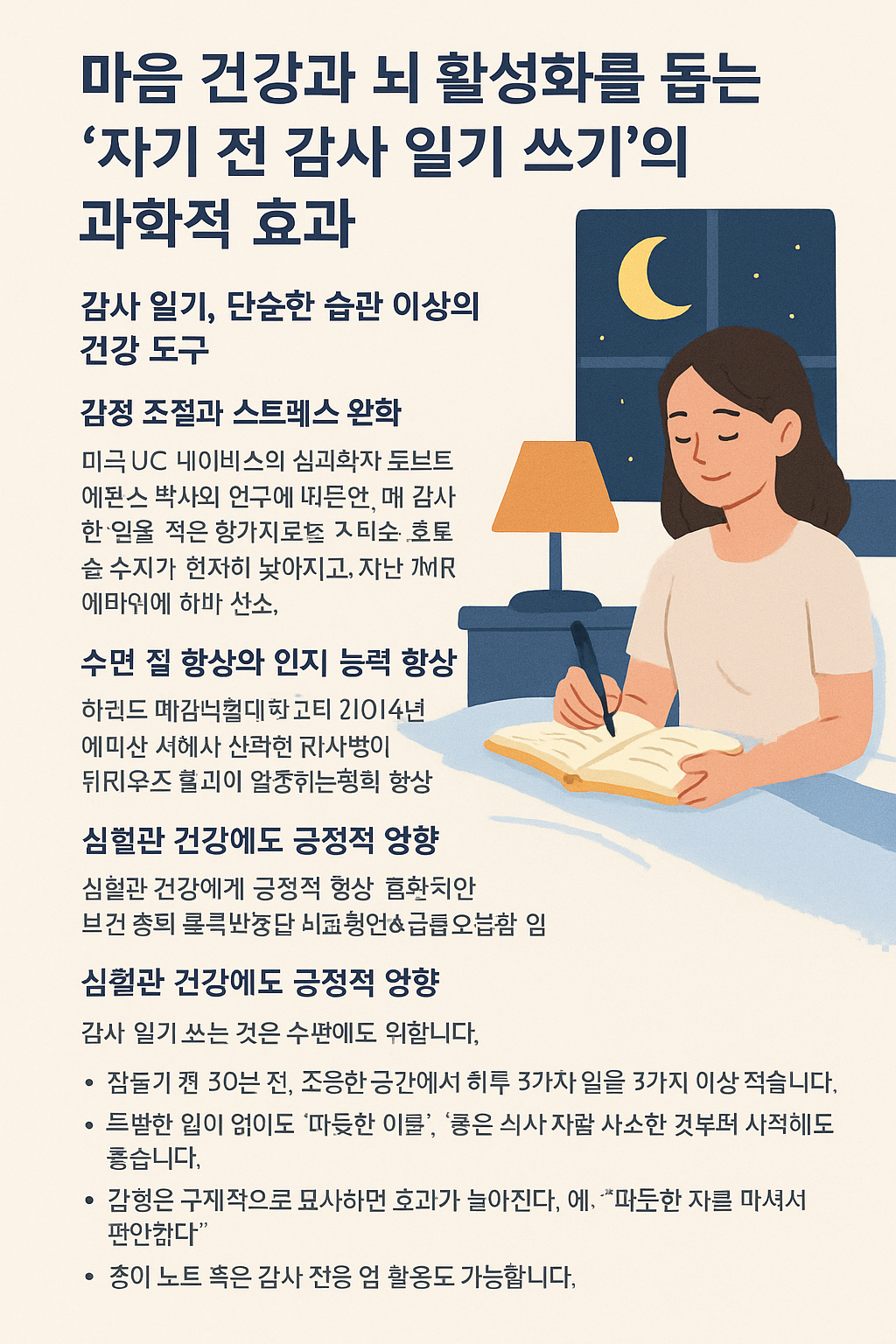 n감사 일기는 마음과 뇌를 건강하게 유지하는 ‘심리적 영양제’입니다. 수면, 인지 기능, 감정 조절, 심장 건강까지 도움을 줄 수 있는 이 간단한 습관을 오늘 밤부터 실천해보세요.반응형