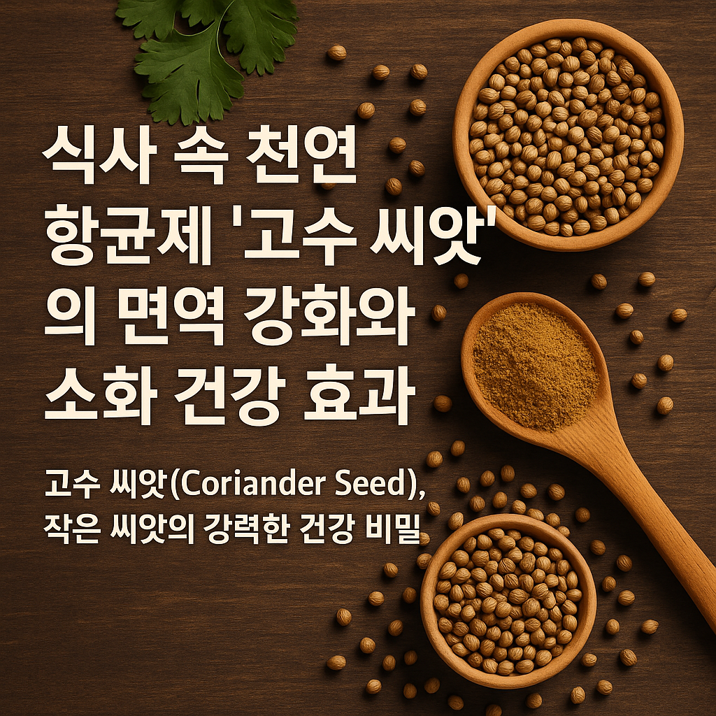 n고수 씨앗은 작지만 강력한 천연 항균제이자 소화 건강 보조제입니다. 위염, 장내 세균 불균형, 혈당 조절 문제를 겪는 이들에게 자연스럽고 효과적인 솔루션이 될 수 있습니다. 식단 속 작은 변화가 전반적인 건강을 개선할 수 있다는 점에서, 오늘 한 스푼의 고수 씨앗은 내일의 면역 방패가 될 수 있습니다.