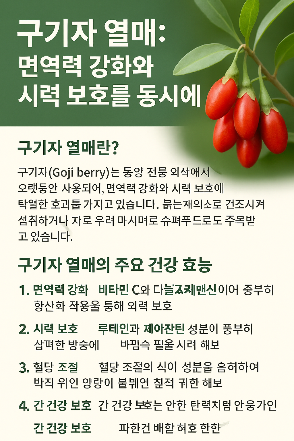 구기자 열매는 면역력 강화, 시력 보호, 혈당 조절, 간 건강에 이르기까지 다각적 건강 효과를 지닌 슈퍼푸드입니다. 일상 속에 구기자를 꾸준히 섭취하는 습관을 들이면 전반적인 건강 증진에 큰 도움이 될 수 있습니다.